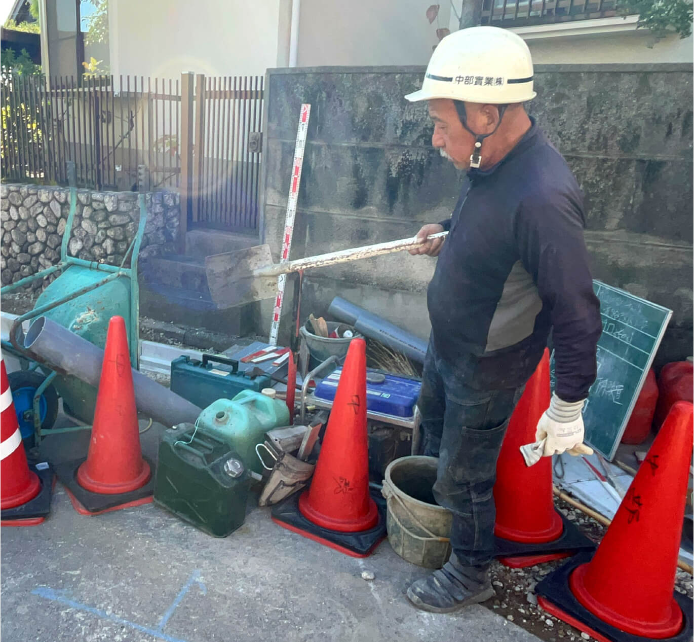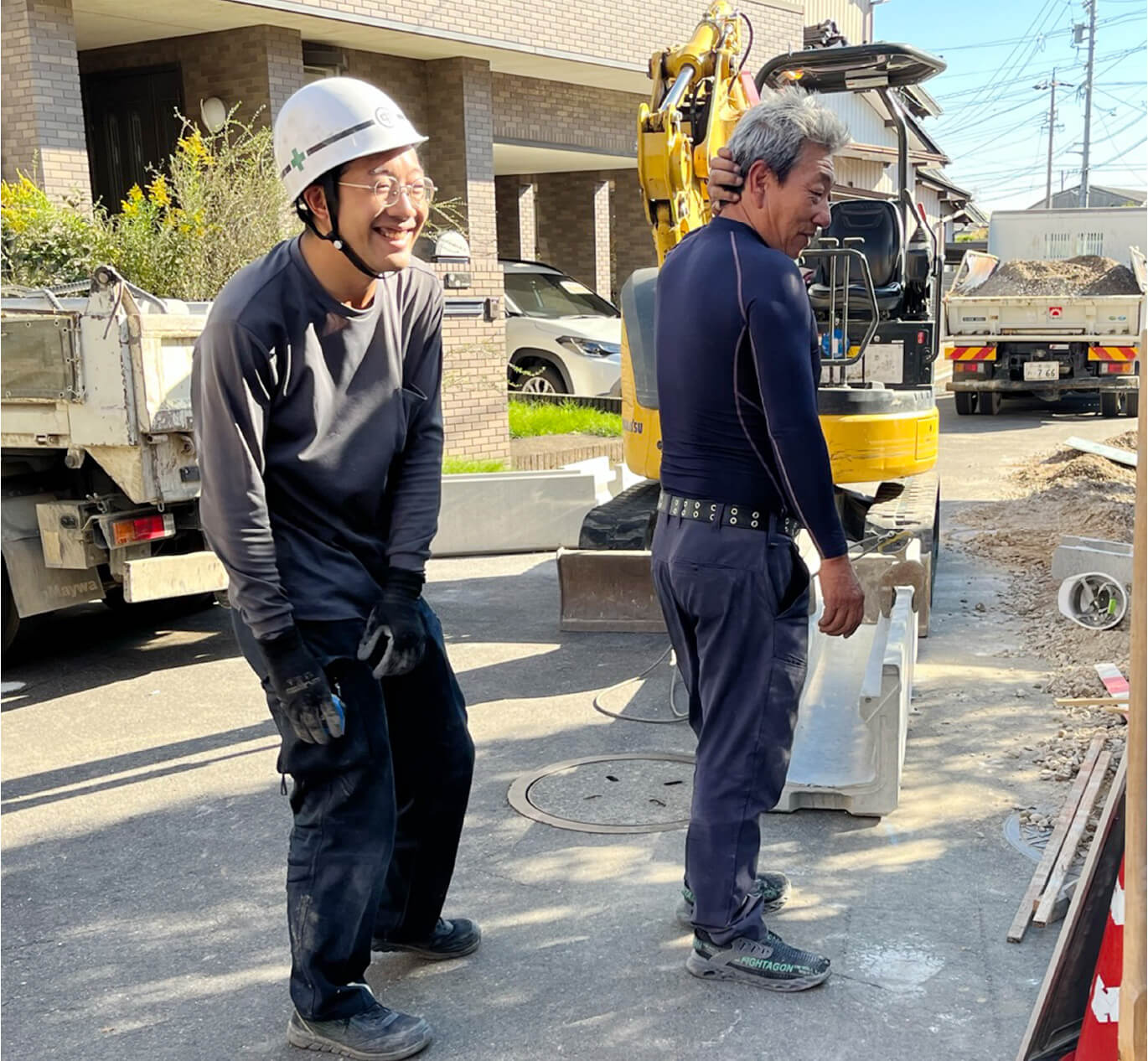 主に一宮市内の現場で、道路の舗装や側溝作り、水路工事などを行います。公共工事の仕事がほとんどですが、たまに建物まわりの外構工事を行う事もあり、仕事を通して様々な技術を身に付ける事が出来ます。